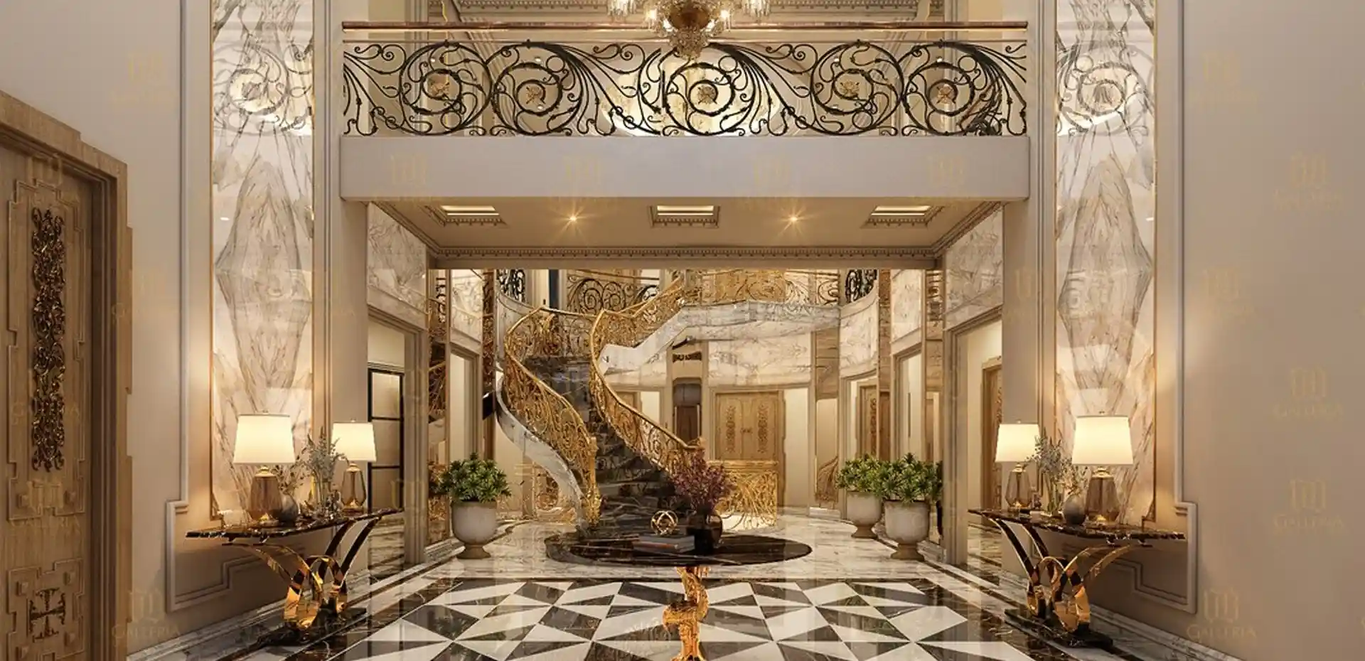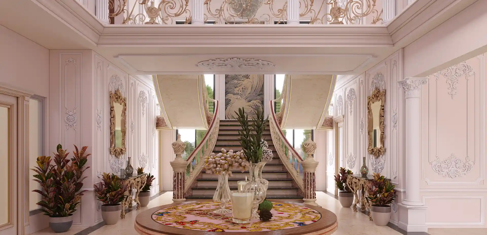 High ceilings, grand staircases, and natural light create a sense of drama and grandeur.